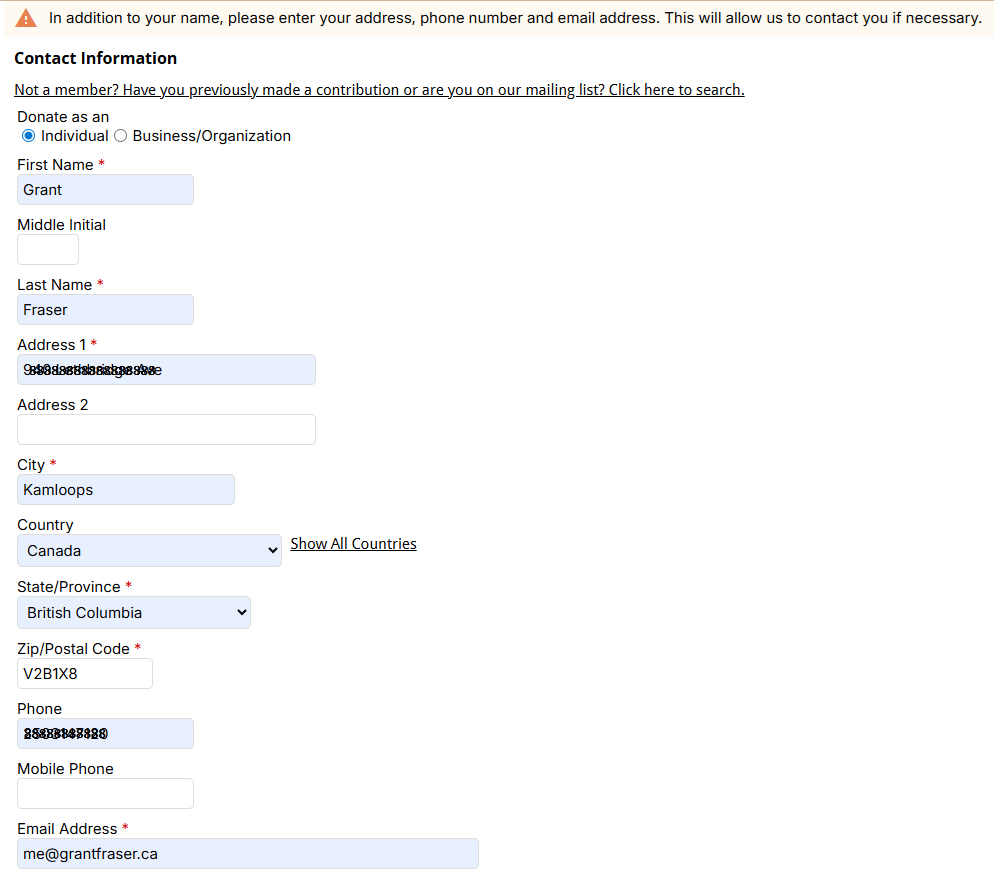 I decided to test the online donation form before sending the link to a friend. I tried to donate without logging in. I got the message that I hadn't entered my address, phone number, or email address. You can see from the screenshot that all of the fields with red asterisks were completed.